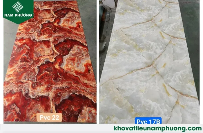 - Tấm ốp PVC: Thường có độ dày từ 2mm đến 5mm, với kích thước lớn, được sản xuất từ hạt nhựa PVC nguyên sinh kết hợp phụ gia. Các tấm này có thể mô phỏng nhiều vật liệu khác như gỗ, đá, bê tông, hoặc có các họa tiết trang trí.