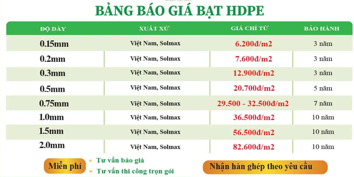 Bảng giá tham khảo bạt HDPE theo độ dày và khổ bạt phổ biến