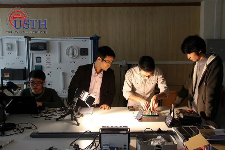 Sinh viên thực hành kỹ thuật điện và năng lượng tái tạo trong phòng thí nghiệm, chuẩn bị cho các dự án địa kỹ thuật môi trường và hệ thống bãi chôn lấp rác.