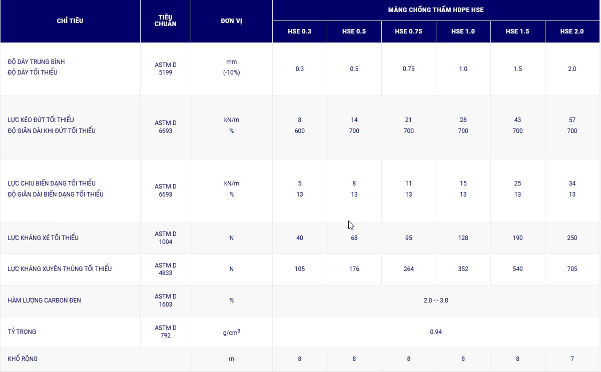 Bảng giá tham khảo màng chống thấm HDPE HSE theo độ dày phổ biến