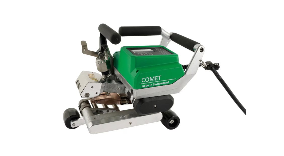 Máy hàn nêm nóng COMET 500 của Leister mang đến sự tiện lợi thiết thực để hàn đáng tin cậy các màng địa kỹ thuật dày và mỏng làm bằng nhựa nhiệt dẻo như PE, HDPE và LDPE. Máy đạt tốc độ lên đến 8 m/phút – mà không cần chuyển đổi hộp số. Áp suất hàn cần thiết có thể được thiết lập trên COMET 500 bằng mô-đun lực có vít điều chỉnh, tùy thuộc vào ứng dụng và/hoặc vật liệu. Nêm nóng được tự động định vị tại đúng điểm trong phần chồng lên nhau.
