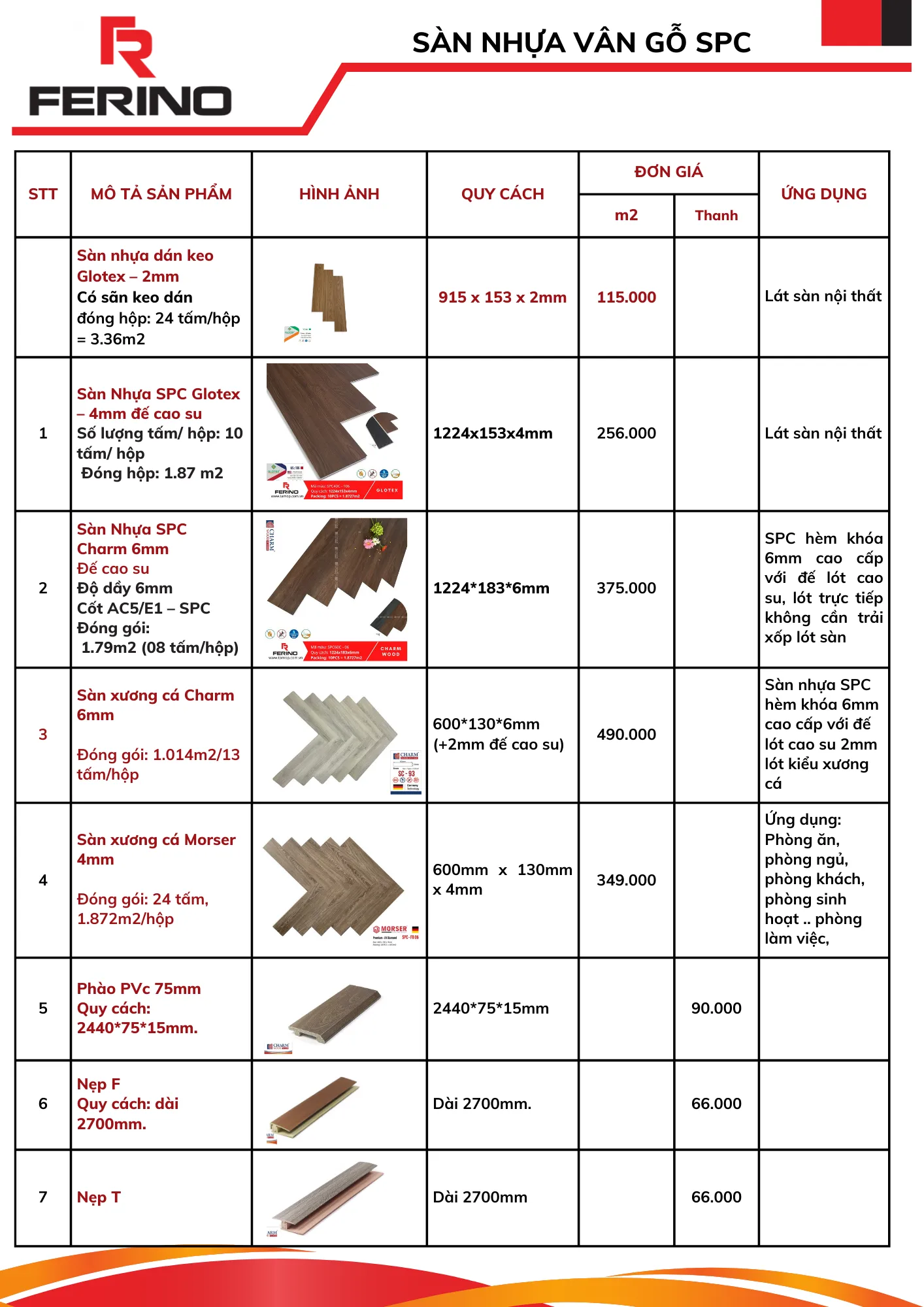 - Sàn nhựa vân gỗ xương cá SPC 6mm Charm: Khoảng 490.000đ/m²